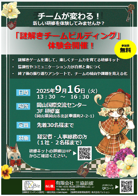 “謎解きゲーム”を取り入れることで、参加者が自然と協力しながら課題解決に取り組むことができる、体験型のチームビルディングです。